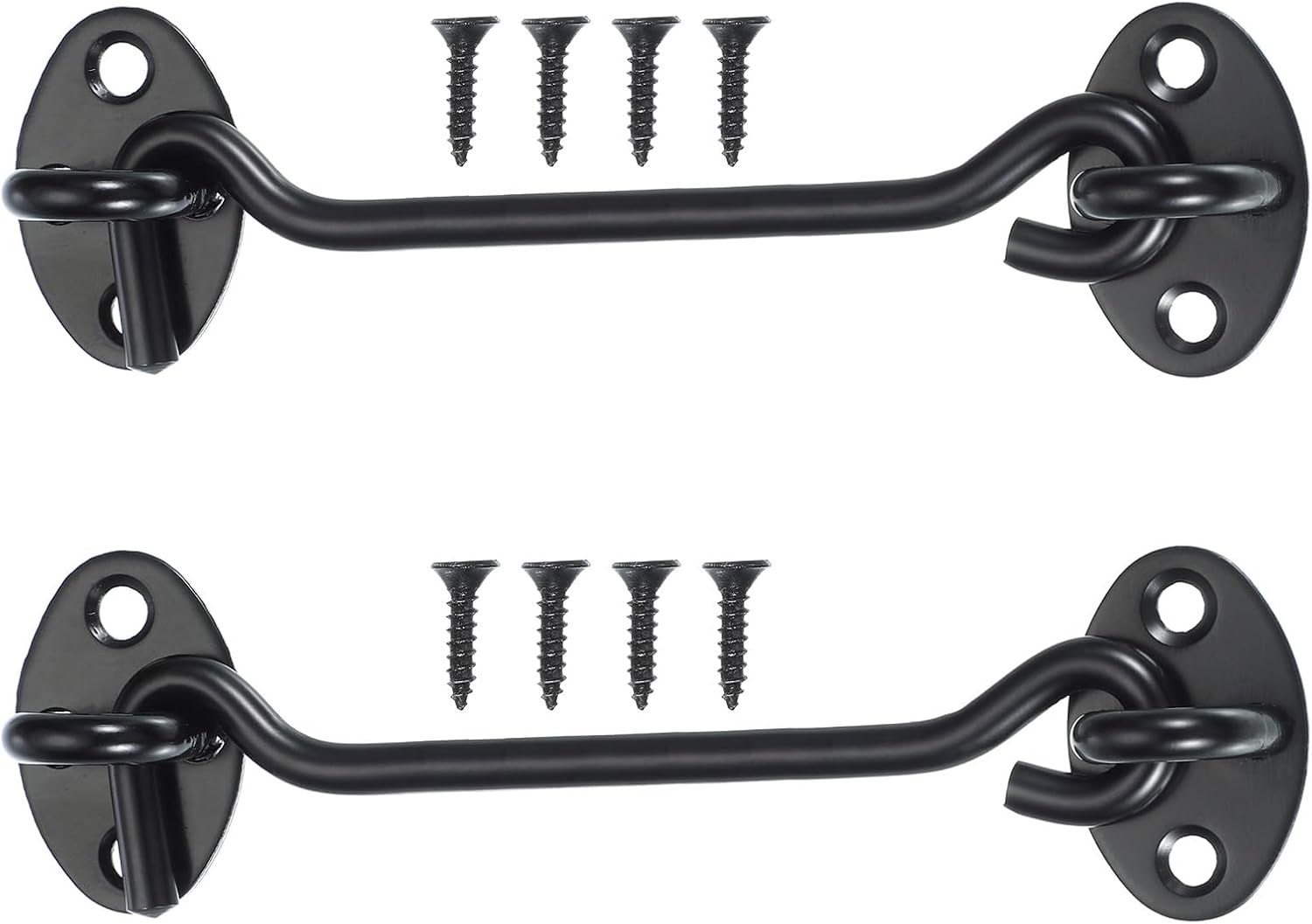 What is this?Hook eye latch, which is widely used in cabinets, sliding barn doors, cabin doors, swing windows, garages, sheds, gate, back doors, closet doors, front porches, fences, cabinets, shutters, alloy windows, etc., to secure the door by hooking the latch into the eye plate, thereby providing privacy and security.What will I get?The package contains 2 hook and eye latches, with 8 mounting screws. The door latch length is 21.5 cm / 8.5 inch; the mounting plate size is (W*H*Thickness): 40x21x2 mm /1.6 x 0.8 x 0.08 inch, the center distance is 27 mm / 1.1 inch, and the screw length is 15mm / 0.6 inchAre there any advantages of the product?The latch hook adopts the end hook design, which will not automatically unlock due to the push of the door, ensuring security and privacy.The stainless steel electroplating process makes the hook and eye latch durable, not easy to rust or breakage, and can be used for a long time in various weather environments.How to use it?Install the eye plate on the door frame and the hook latch on the corresponding door edge, aligning to ensure proper engagement.Close the door and hook the latch into the eye plate to secure the door in place.To unlock, simply lift the hook from the eye plate to release the door.What should I notice?Please confirm the door latch size is suitable for your door before placing an order.